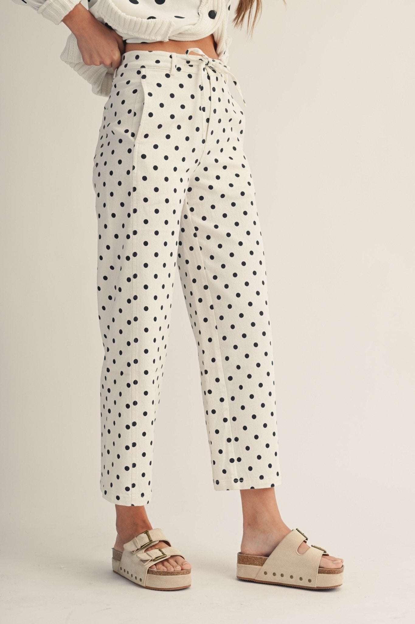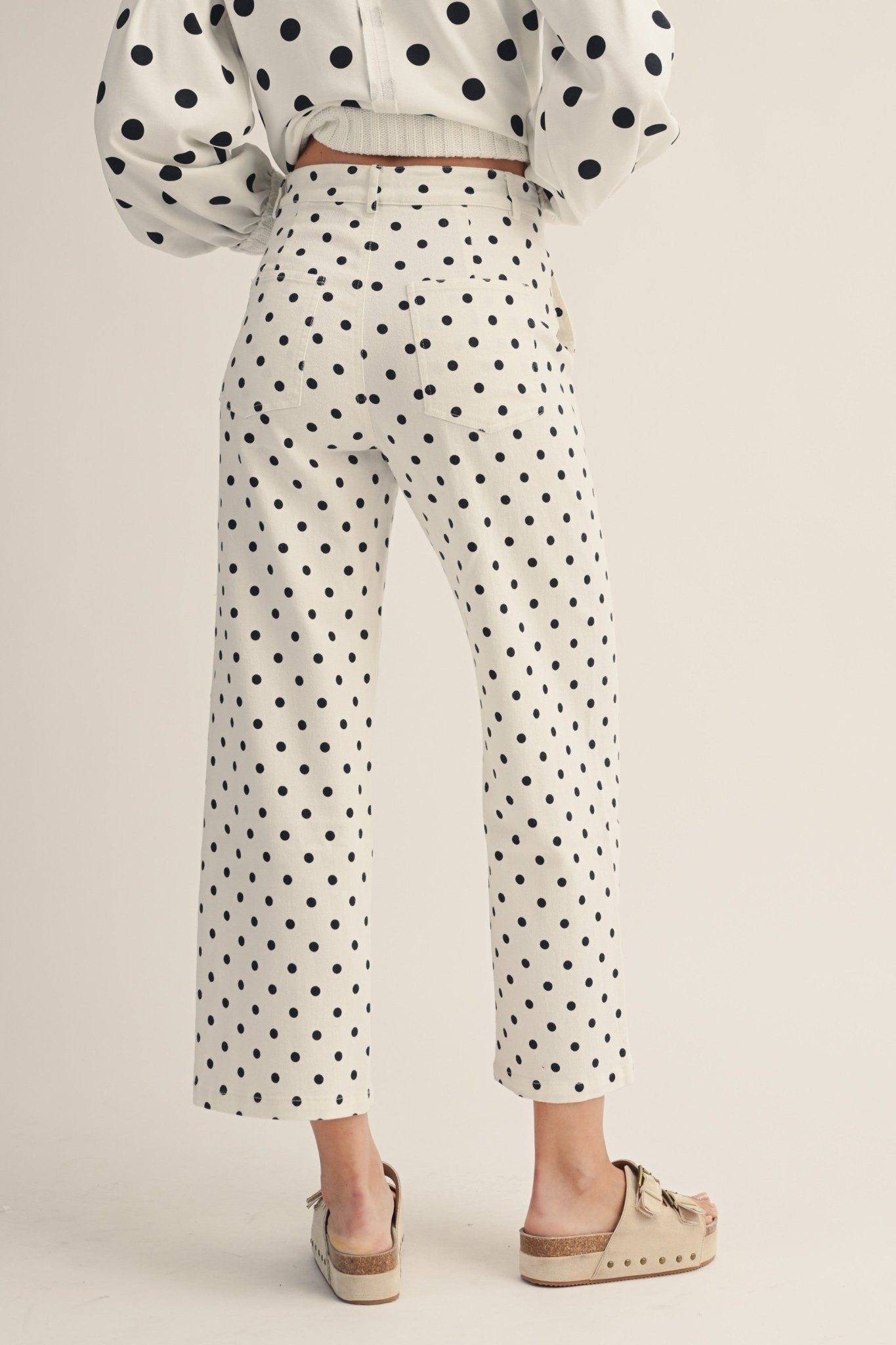 High-waisted vintage vibes meet modern comfort in these playful polka dot wide-leg pants. Crafted from a breathable cotton-blend fabric with just enough stretch, they're designed to move with you while keeping that timeless, editorial edge. Perfect for styling with everything from crisp whites to bold prints—a wardrobe essential that feels both nostalgic and fresh.