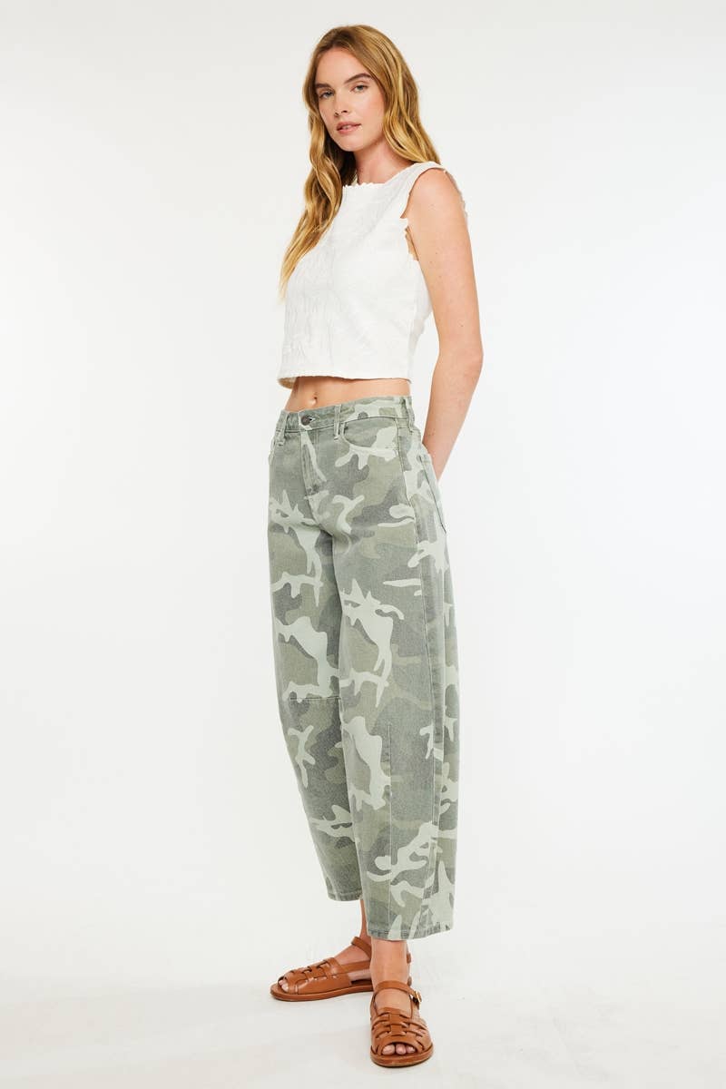 These high-rise horseshoe fit jeans combine a refined camo print with a rich green tone for a sophisticated edge. Crafted from 99.3% cotton and 0.7% spandex, they offer comfortable stretch and durability. Featuring an 11" rise and a 26.5" inseam, the design includes a zipper fly and subtle dart detailing, creating a flattering silhouette without distressing. Perfect for those seeking a polished yet casual look with a modern twist.