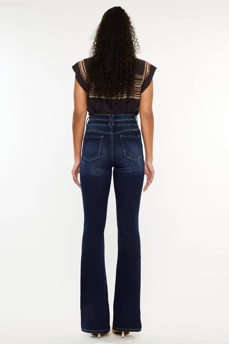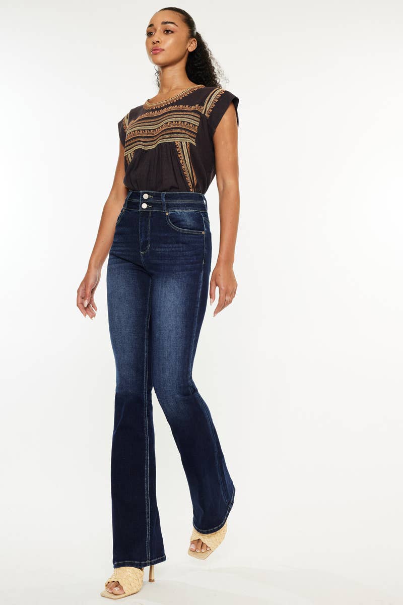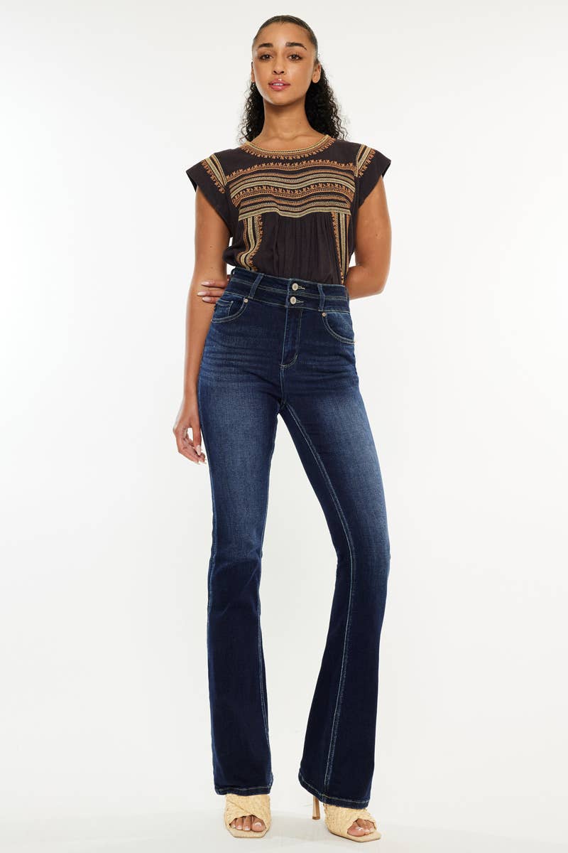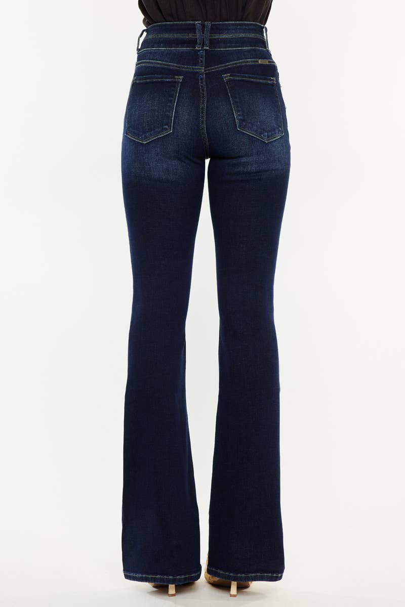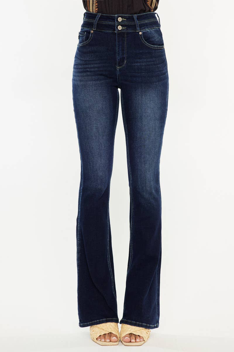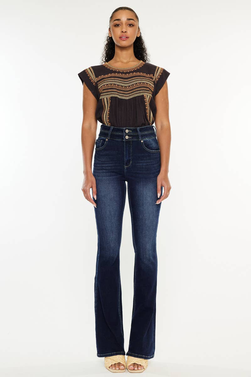 KanCan Heritage Boot jeans offer a refined blend of comfort and style with their dark wash and super stretch fabric. Featuring a high-rise, bootcut silhouette with a 9 1/2” leg opening and a flattering wide double waistband, these jeans provide a sleek fit without distressing. The classic five-pocket design, double button, and zipper closure enhance both function and elegance. Crafted from a durable blend of cotton, spandex, and polyester, they ensure lasting wear and a polished look for any occasion.