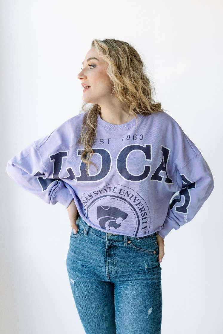 Our Cropped Long Sleeve Crewneck! A fan favorite featuring a raw hem, dropped shoulder, and the perfect lightweight material. It fits like a dream and adds a girly touch to your collegiate wardrobe. Pairs well with denim shorts and cowboy boots for game day!