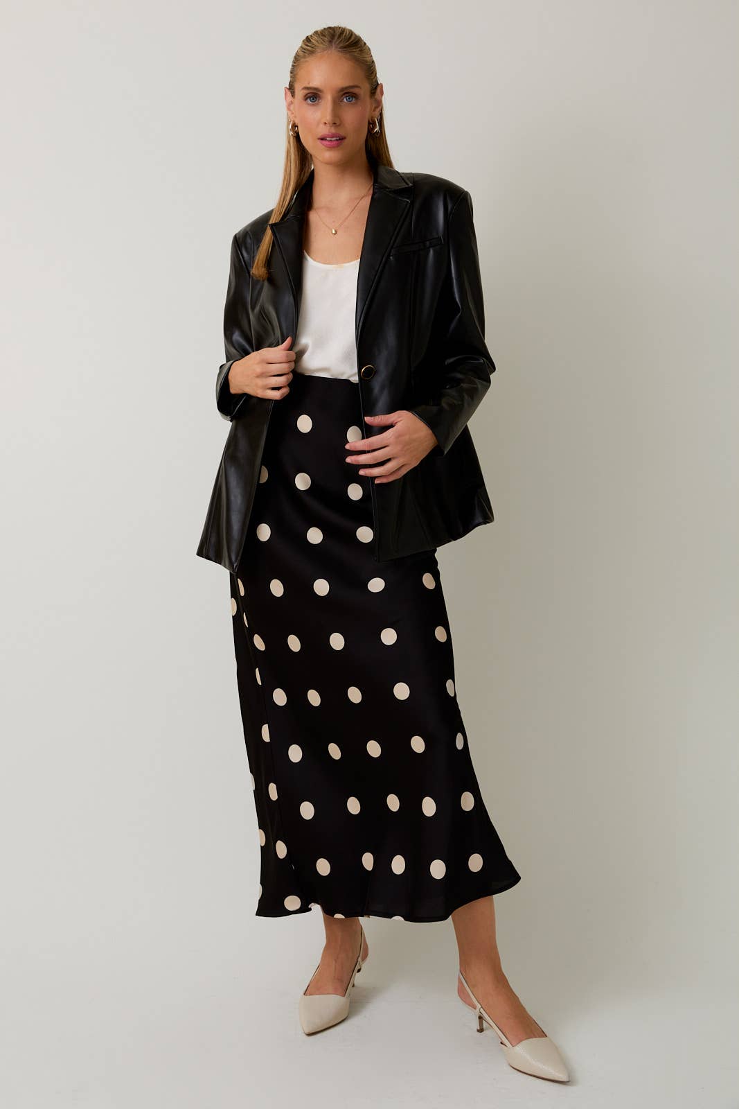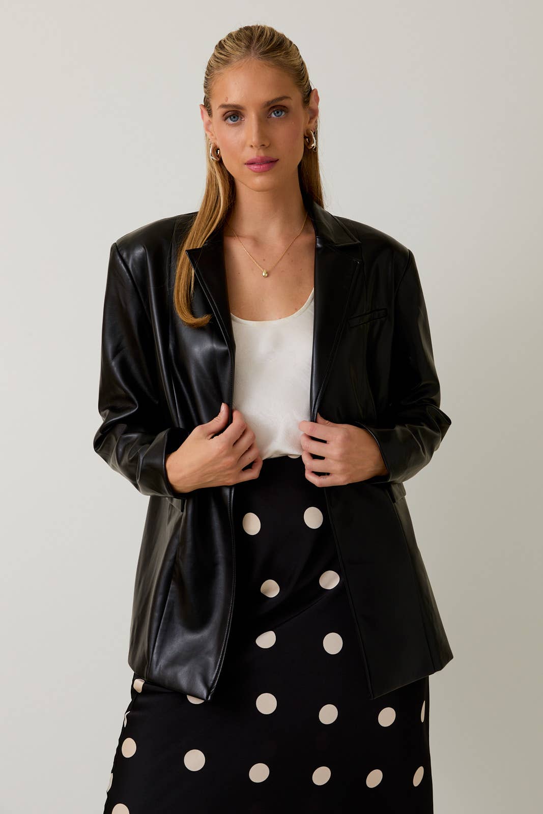 The Bold Move Blazer in black is an oversized faux leather piece designed to combine edgy style with comfort. Tailored for a relaxed yet structured fit, it offers a sleek silhouette ideal for layering. Crafted from high-quality materials, this blazer adds a bold, contemporary edge to any outfit, perfect for those seeking a statement outerwear option with expert styling versatility. The model wears a size small, emphasizing its roomy but flattering cut suitable for various body types.