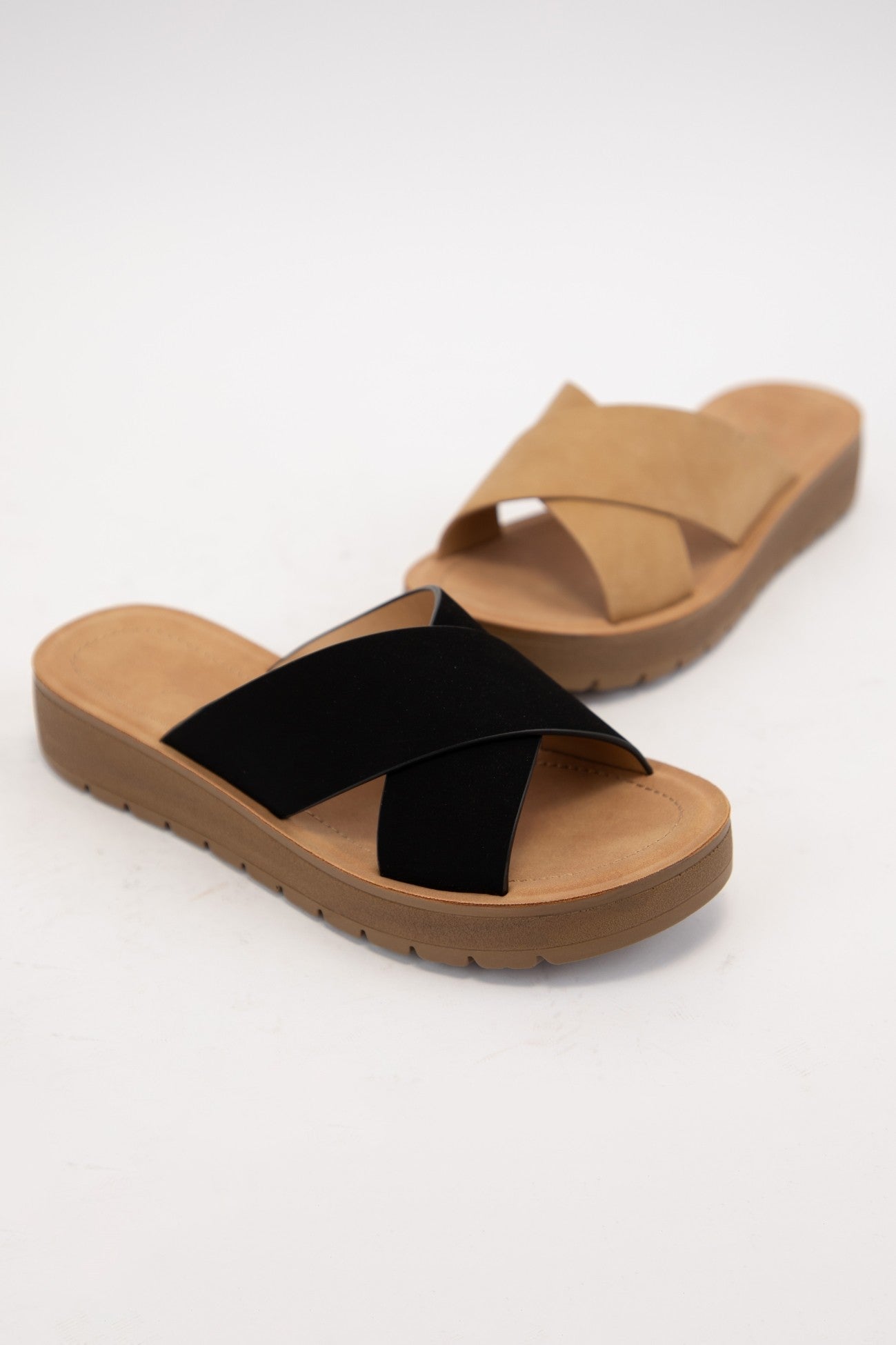The Lucy Sandal combines effortless style with all-day comfort. Featuring a bold cross strap design and lightweight foam sole, this slip-on sandal is perfect for warm-weather wear. Crafted from faux PU and nubuck PU materials, it offers durability and a premium feel. With a 1.35" heel height, it provides subtle lift without sacrificing comfort. Slip them on and go—ideal for casual outings, errands, or relaxed weekend looks.