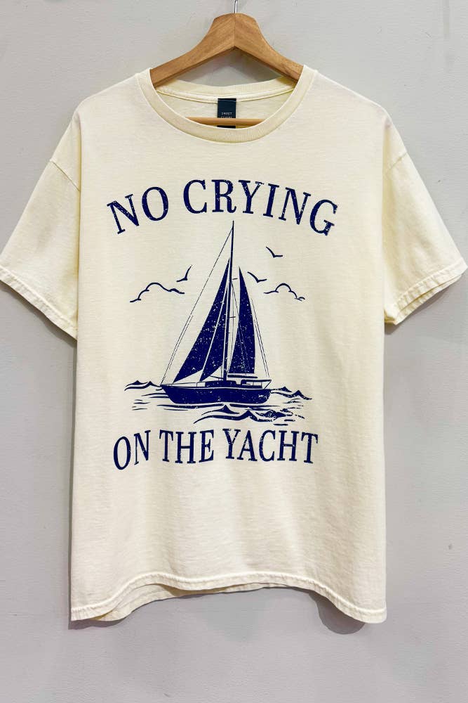 Cream-colored graphic tee with a vintage-style sailboat and "NO CRYING ON THE YACHT" slogan. Relaxed fit in soft cotton blend delivers all-day comfort, while the crewneck and short sleeves keep the look classic and versatile. Perfect for coastal getaways, beach days, or anyone who loves nautical charm with a playful edge. Pair with striped linen for a polished seaside look, or throw it on with denim shorts for effortless casual style.