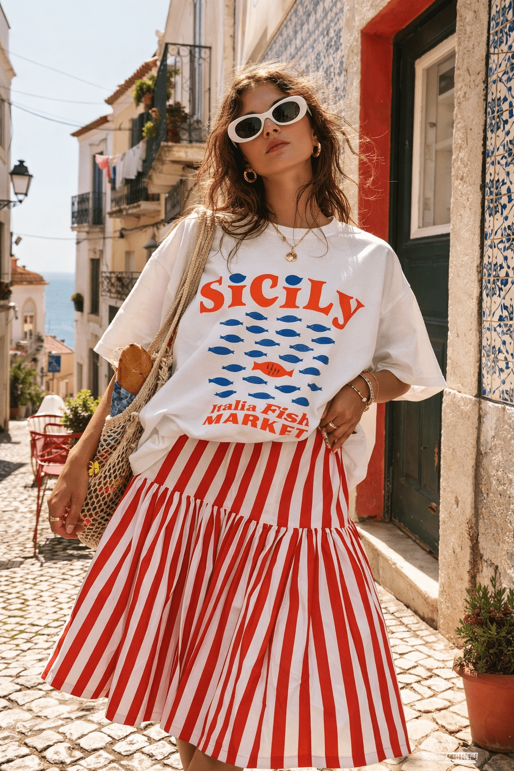 Embrace the spirit of the Italian coast with this charming graphic t-shirt. Featuring a playful "Sicily Italia Fish Market" print in vibrant orange and blue, this tee is a wearable postcard from a sun-drenched destination. Crafted from soft, breathable cotton, it offers a relaxed, oversized fit for ultimate comfort, perfect for exploring cobblestone streets or enjoying a leisurely seaside stroll. The classic crew neck and short sleeves make it a versatile staple for any casual wardrobe. Pair it with the matching striped skirt for a complete, eye-catching ensemble that exudes effortless Mediterranean chic. This t-shirt is more than just apparel, it's an invitation to adventure and a celebration of coastal charm.